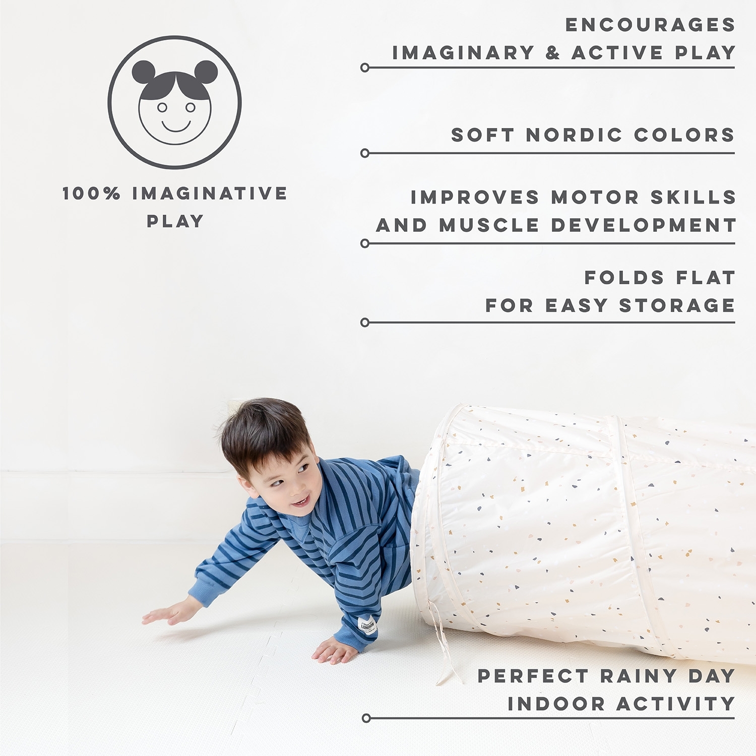 Tunnel en tissu recyclé. Dimensions : 1.80 m de longueur et 0.46 m de diamètre. Compact et transportable. Se nettoie au savon et à l'eau. Polyester recyclé. 3+