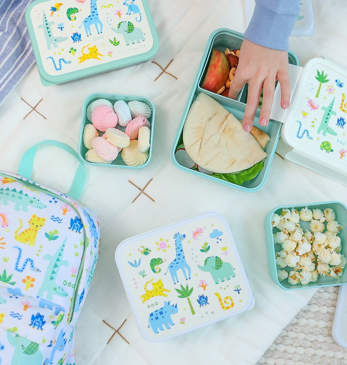 Range tes encas préférés dans les boîtes de ce set complet lunch et snack box. Emporte facilement des fruits, des crudités, des biscuits, des bonbons et des sandwichs dans ces boîtes. Ces lovely lunch et snack box sont disponibles en set de quatre tailles différentes, et sont toutes décorées. Pratique pour l’école, dans la voiture ou pour une excursion. Le set lunch et snack box est fabriqué en polyéthylène. Le matériau utilisé ne convient pas au lave-vaisselle, ni au micro-ondes. Nous vous conseillons également de nettoyer toutes les pièces du set à l’eau chaude savonneuse avant utilisation.